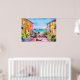 L'affiche d'une fête d'art de l'aquarelle numérique générée par l'IA de charme présente un village balnéaire de maisons colorées de 2 étages, des pots de fleurs et des vues sur les voiliers au coucher du soleil. L'accueil "Joyeux anniversaire" est personnalisable