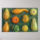 Une collection de huit gourdes et citrouilles est aménagée sur un arrière - plan vert rustique. Les gourdes sont de différentes formes, tailles et couleurs, orange, jaune, vert et blanc. Certaines ont des surfaces lisses, d'autres sont bosselées ou nervurées. L'image a une allure naturelle et rustique, avec un accent mis sur les textures et les couleurs des gourdes.