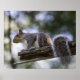 A squirrel with a bushy tail sits on a weathered tree branch. The background is softly blurred, highlighting the animal's details.