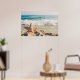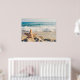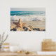 Poster avec une photo pittoresque. Une grande étoile de mer dressée sur une plage de sable. Une belle mer bleue avec des vagues de surf blanc en arrière - plan.