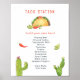Jolie pancarte pour enterrement de vie de jeune fille au bar à tacos avec liste des garnitures pour tacos, avec de mignons tacos aquarelle peints à la main.
