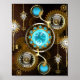 Turquoise lenses with antique watch with brass gears and golden keys on rusty, brown background. Steampunk style.
