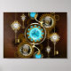 Turquoise lenses with antique watch with brass gears and golden keys on rusty, brown background. Steampunk style.