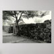 Nostalgic black and white photograph of a mossy stone wall with a tile roofed Japanese gate under a spreading tree. This photograph was taken in the countryside of Kyoto.