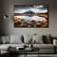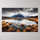 Snow-capped peaks rise beneath stormy skies, their perfect reflection resting on still waters. Golden grasses contrast with raw natural power—a scene of strength, serenity, and untamed beauty.