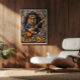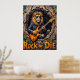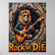 Cette oeuvre d'art captivante représente un lion, qui a l'air sans effort cool dans les lunettes de soleil et une veste en cuir, livrant des "fûts primaires" sur une guitare électrique de l'intérieur d'un arbre texturé creux. Les éléments naturels de la forêt encadrent subtilement la scène, tandis que le message "Rocher ou Mourir" proéminent renforce l'énergie brute. L'impasto épais et expressif crée une texture tangible, faisant résonner la passion du lion pour la musique