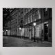 Vue nocturne sur les bâtiments historiques et la rue pavée d'Altstadt Dusseldorf. Les gens marchent dans un mouvement flou. Photographie en noir et blanc de style architectural européen / allemand.