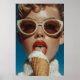 Un gros plan surprenant et d'inspiration rétro d'une femme glamour dans des lunettes de soleil surdimensionnées qui profite d'un cône glacé crémeux sous le soleil. L'image est composée d'un rouge à lèvres gras, d'une peau sans défaut et d'un chandail tricoté au gaufre élégant, incarnant la mode vintage avec une touche moderne.
