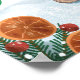 Une scène d'hygge se déroule, présentant un Jultomten festif orné d'un casquette tricot vert, d'un chandail rouge douillet, et de minuscules bottes brunes, savourant un bol de porridge à la vapeur par jour enneigé. De superbes grappes d'oranges séchées, de pins et de baies forment une frontière dynamique. Illustration originale de Noël Snow