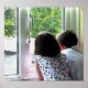Garçon et fille regardant par une fenêtre à la pluie d'été
