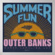 Summer Fun OBX Outer Banks North Carolina USA Style Vintage Distressed Graphic Design. Nags Head Hatteras Corolla Duck Manteo Rodanthe Ocracoke Beach Bum Sand Sea Waves Ocean Barrier Islands. Lettres roses. Arrière - plan bleu marine.