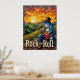 Une oeuvre d'art imaginative représentant un requin bleu, portant un chapeau haut et des lunettes de soleil élégantes, livrant une "serenade du coucher de soleil" sur une guitare électrique d'un point de vue rocheux. Le paysage se déploie sur des collines et des arbres verdoyants, baignés par la chaleur du soleil couchant. La brosse épaisse et expressive ajoute une touche tactile et dynamique à toute la composition, en mettant l'accent sur l'énergie "ROCK and ROLL".