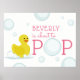 Une affiche baby shower illustrant l'illustration d'un canard en caoutchouc et de bulles incorporées dans le texte "Sur le point de POP". Personnalisez le nom. Des invitations assorties à la douche pour bébé et des articles de coordination sont disponibles chez Jill's Paperie.