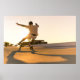 Surf skater entraînement surf se déplace près de la plage au coucher du soleil.
