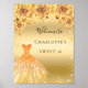 Une affiche de bienvenue pour une fête Sweet 16, 16e anniversaire. Un arrière - plan faux or avec de la poussière de parties scintillant faux or, une robe et des roses, des fleurs. Personnalisez et ajoutez un nom.