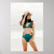 A woman in a teal swimsuit and straw hat walks on the beach. She appears happy and carefree as she basks in the ocean breeze.