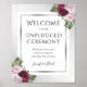 Elégant floral "bienvenue à notre cérémonie débranchée" chanter aux couleurs bordeaux, rousses et argentées pour que vos invités mariages sachent mettre leurs téléphones et appareils photo pendant votre cérémonie de mariage. Éléments correspondants disponibles.