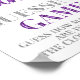 Candy deviner le poster de jeu pour le baby shower en violet foncé et motif confetti argent. Veuillez noter que l'effet de parties scintillant n'est que photographique.