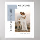 Un design simple, facile à personnaliser et qui plaira à vos invités ! Ajoutez votre photo verticale préférée à ce signe de bienvenue mariage. Ensuite, vous personnaliserez avec vos prénoms. Ajoutez enfin la date. Vous venez de créer votre signature d'accueil photo unique pour votre mariage. Placez-le dans une position de premier plan où les invités peuvent facilement le voir. Il y a un rectangle bleu poussiéreux qui coordonne avec la photo. Si vous souhaitez une autre couleur, vous pouvez le faire via le menu d'édition. Vous pouvez également contacter le concepteur qui peut modifier la couleur pour vous.