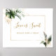 Cette enseigne de dessert mariage présente du feuillage tropical vert aquarelle, de la monstère, des feuilles de palmiers, des feuilles de bananes et des feuilles en faux or avec un cadre rectangle en faux or. Il est parfait pour un mariage tropical, plage ou destination.