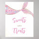 Plongez dans un monde de douceur avec notre charmant panneau "Sweets and Tras", avec une adorable queue de sirène dans les tons violets. Ce panneau modifiable ajoute une touche fantaisiste à votre événement tout en guidant les clients à se livrer à de délicieux desserts et gâteries. Personnalisez-le pour convenir à l'ambiance de votre fête et faites briller votre table de desserts comme un trésor sous la mer !
