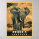Revivez l'âge d'or des safaris africains avec cette affiche vectorielle vintage. Doté d'un éléphant majestueux sur la savane, entouré de véhicules de safari, ce tableau capte l'essence des affiches de voyage rétro. Des lignes en gras, des couleurs plates et des formes géométriques créent une pièce visuellement frappante dans les tons de terre bouchée. La silhouette stylisée du paysage africain ajoute profondeur et contexte à la scène.
