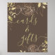 Cette affiche présente des pivoines et des feuillages dorés dans un style de dessin moderne et minimaliste sur un arrière - plan solide. "Cartes & Cadeaux" dans la police d'or correspondante dispose d'une typographie manuscrite cursive. Ce panneau est le moyen idéal de faire savoir aux mariages ou aux clients de douche où laisser leurs cadeaux.