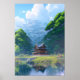 Dans cette oeuvre d'art numérique, un petit temple japonais calme est entouré d'une belle forêt verte sur un lit de rivière. Les eaux paisibles de la rivière sereine reflètent le ciel au-dessus et la forme exquise du temple lorsqu'ils passent doucement. Les bruits de feuilles et de bavardages d'oiseaux remplissent la forêt qui entoure le sanctuaire.