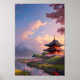Cette oeuvre d'art numérique capture la sérénité d'un temple japonais traditionnel en bois assis sur la rive d'une rivière calme, avec un magnifique coucher de soleil en arrière - plan. L'atmosphère paisible et la lumière douce et chaude du soleil créent un cadre paisible et idyllique.