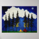 Impression d'une peinture acrylique réalisée par Jeremy Bonsol. Tente rouge et scène de feu de camp éclairant les arbres en silhouette au premier plan. Des étoiles et des nuages remplissent l'arrière - plan pour créer une scène de camping nocturne paisible dans les bois.