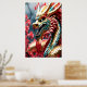 Un dragon qui respire le feu avec des écailles d'or vibrantes, présentant ses dents terriblement grandes, ombrage et textures réalistes, détail élevé, angle rapproché, arrière - plan foncé avec des points saillants, peinture numérique résolution 4k, éclairage cinématique, atmosphère effrayante.Sur cette photo d'intelligence artificielle.fermer la tête de dradon avec des feuilles d'arbre rouge derrière lui.