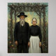 An elderly couple stands in front of a wooden arbor entwined with vines and flowers. They wear solemn expressions and traditional black clothing, creating a stark contrast with the colorful background.