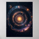 Set in a rich cosmic palette of midnight black, galactic purple, radiant gold, and starlight white, each element glows softly, with faded motion trails and space-dust textures adding depth and intrigue. The composition evokes a sense of wonder—like watching the universe organize itself into order and beauty. The visual rhythm speaks to both the chaos and harmony of the cosmos.