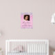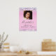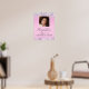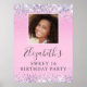 Pretty and girly sweet 16 birthday party welcome poster featuring her photo, sparkly holographic purple, pink and silver faux glitter confetti along the borders against a pink background and her name in a soft grey trendy script.