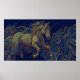 A full-size, close-up poster of a horse drawn with soft yellow, blue, and orange lines on a dark blue background. Abstract vector fractal art, wave function, Zentangle style, and 3D shading combine to create a mesmerizing, intricate pattern. The vibrant, flowing lines create a sense of dynamic movement against the deep, contrasting background, evoking a powerful and artistic representation of the animal.