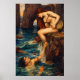 The Siren by John William Waterhouse is a haunting seascape where myth and emotion collide. On a rugged coastal ledge, a red haired siren bends over her lyre, absorbed in her song as the tide churns below. A struggling man reaches upward from the water, his gaze fixed on the figure above, caught between desperation and enchantment. The rocky cliffs and dark arch of stone frame the scene like a stage, while the sunset light warms the siren’s skin and hair in sharp contrast to the cold blues and greens of the sea.