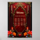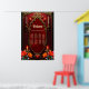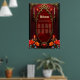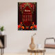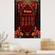 The spirit of the wonderful vintage style. Elegant gold-decorated vintage frame against a deep red background. A subtle texture reminiscent of rose petals is visible inside the frame. Tall, slender candles in gold candlesticks flank the frame, while additional smaller candles are placed higher up. Bright flowers in shades of red, orange, and teal add a mystical splash of color.