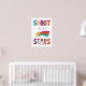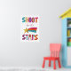Le style amusant et peint en lettres épingle le message SHOOT FOR THE STARS en bleu, jaune, lavande, orange et rose contre un arrière - plan blanc clair ainsi qu'un graphisme d'étoile tournante assorti.