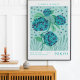 Un design serein et aux tons frais qui mélange des éléments botaniques d'inspiration japonaise avec une esthétique d'exposition minimaliste. Cette illustration présente des hortensias luxuriants et superposés dans une palette sophistiquée de bleu marine, de sarcelle et de vert sauge doux, sur un fond de menthe apaisant avec de délicates fleurs flottantes.