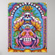 Cette illustration très complexe et vibrante de couleur représente une créature ou un être fantastique, empilé de totem, riche d'influences psychédéliques. À la base se trouve une grande entité, grinçante, ressemblant à une grenouille, dans les tons rose et violet, avec de multiples yeux et un large sourire denté. Au-dessus se trouve un autre visage abstrait aux yeux multiples, avec un troisième oeil proéminent, orné d'éléments ondulés jaunes et roses qui ressemblent à des plumes ou des flammes. Crowning the stack est un crâne blanc stylisé, encadré de rayons déchiquetés, colorés et de nuages tourbillonnants. L'ensemble de la composition est placé dans un cadre voûté et ornemental avec des motifs audacieux et multicolores, contre un arrière - plan bleu vif. Le style artistique rappelle les affiches de contre-culture des années 60 et l'art populaire.
