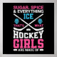 Poster du thème de hockey pour la jeune fille de hockey avec des rondelles de hockey, des bâtons et des casques avec texte rose, blanc et bleu qui dit Sucre, épices et tout Ice C'est de quoi les filles de hockey sont faites!