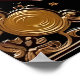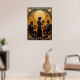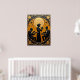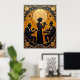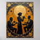 Ce tableau orné représente un trio de jazz en noir contre un arrière - plan doré richement texturé. Une femme se tient au centre en jouant une trompette, flanquée de deux musiciens assis, l'un avec une trompette et l'autre avec un clavier. L'arrière - plan présente une grande lune dorée stylisée, des étoiles et des motifs décoratifs complexes en noir et or, évoquant une époque glamour et intemporelle de la musique jazz.