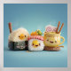 Trois amis de la nourriture japonaise irrésistiblement joyeux posent ensemble sur un fond bleu doux avec une vapeur douce s'élevant de leurs plats. Un grand onigiri souriant avec un visage jaune ensoleillé et une palette en bois est assis à côté d'un heureux rouleau de sushi aux crevettes surmonté de roe orange et de wasabi frais, tandis qu'une tasse de ramen jaune vif avec des tourbillons de narutomaki, des baguettes et un large sourire complète l'équipage adorable. Cette illustration kawaii ludique éclate de charme, de couleur et de joie gastronomique, ce qui la rend parfaite pour les t-shirts, les autocollants, les coques de téléphone, les mugs, les sacs fourre-tout, les tabliers et les cadeaux pour les amateurs de sushi, les fans de ramen et tous ceux qui adorent l'art de la cuisine jap