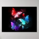 Trois papillons lumineux, rouges, violets, verts, texturés, de nuit sur fond noir lumineux.