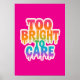 Faites une déclaration qui brille d'ironie et de flair sans excuses. Too Bright to Care est une oeuvre typographique audacieuse qui présente des lettres de néon dégoulinantes et des couleurs vibrantes qui rayonnent de l'énergie rebelle. Conçu pour se démarquer, il mélange l'esthétique pop rétro à un ton ludique et insouciant, parfait pour ceux qui vivent fort et brille plus fort.