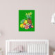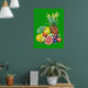 Poster in a collage of colorful tropical fruits including pineapple, papaya, mango, gogi berries, kiwi, and lime, with a tropical theme of rich textures and lush foliage.
