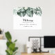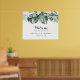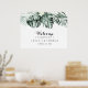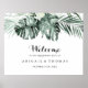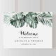 Ce panneau de bienvenue pour une fête de fiançailles tropicale avec de la verdure et des fleurs blanches est parfait pour une célébration de fiançailles rustique. Le design présente des bouquets de feuilles de palmier vertes avec de jolies fleurs blanches.