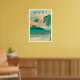 Retro style hand painted vintage style travel poster of Maui in Hawaii. Features aqua blues and greens, with sandy tones and Palm trees.