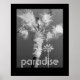 affiche tropique photo en noir et blanc de palmiers avec texte paradis en lettres blanches disponibles sous forme de 8 x 10 ou 16 x 20 art mural. Art original et photographie par Ann Powell sur affiches et art mural. Photographie copyright Ann Powell tous droits réservés.
