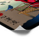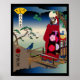 Cette impressionnante oeuvre d'art de style imprimé en bois japonais présente une touche moderne de l'art traditionnel ukiyo-e, avec un chat siamois portant un luxueux kimono rouge décoré de motifs floraux roses et blancs vibrants contre un arrière - plan hexagonal noir. Le chat se dresse contemplativement sur une véranda en bois (engawa), en contemplant un lointain mont Fuji sous une pleine lune. La scène capture un moment de sérénité avec les éléments traditionnels japonais : pins aux aiguilles émeraude, nuages stylisés, et un oiseau bleu (peut-être un mynah) perché sur la rampe. Dans l'arrière - plan, une petite table abrite ce qui semble être un bol décoré d'un motif à vagues (波), ajoutant à l'esthétique japonaise. La composition comprend des éléments ukiyo-e classiques tels que le cartouche en forme de ventilateur jaune en haut à gauche contenant des caractères japonais, et un joint circulaire rouge avec kanji en bas à gauche. L'oeuvre combine habilement l'élégance raffinée de l'art japonais traditionnel et le fantaisie contemporain à travers son protagoniste félin. La palette de couleurs est particulièrement saisissante, avec des roseaux et des noirs profonds du kimono qui contrastent magnifiquement avec le dégradé subtil du ciel et le vert verdoyant des aiguilles de pin. L'ensemble crée un mélange harmonieux d'art japonais classique et de sensibilités modernes, ce qui en fait une pièce sophistiquée adaptée aux espaces intérieurs traditionnels et contemporains. L'oeuvre conserve avec succès l'équilibre, la composition et l'attention aux détails caractéristiques des tirages ukiyo-e tout en introduisant des éléments ludiques et contemporains qui le rendent unique pour le public moderne.